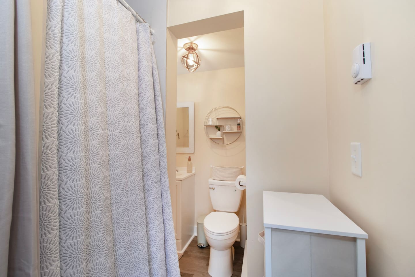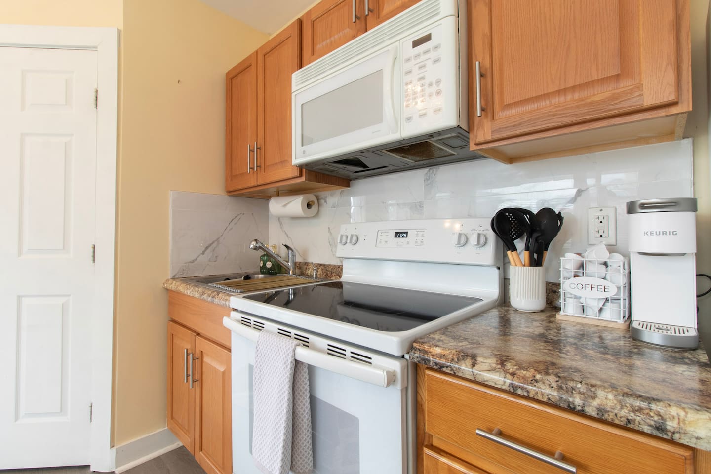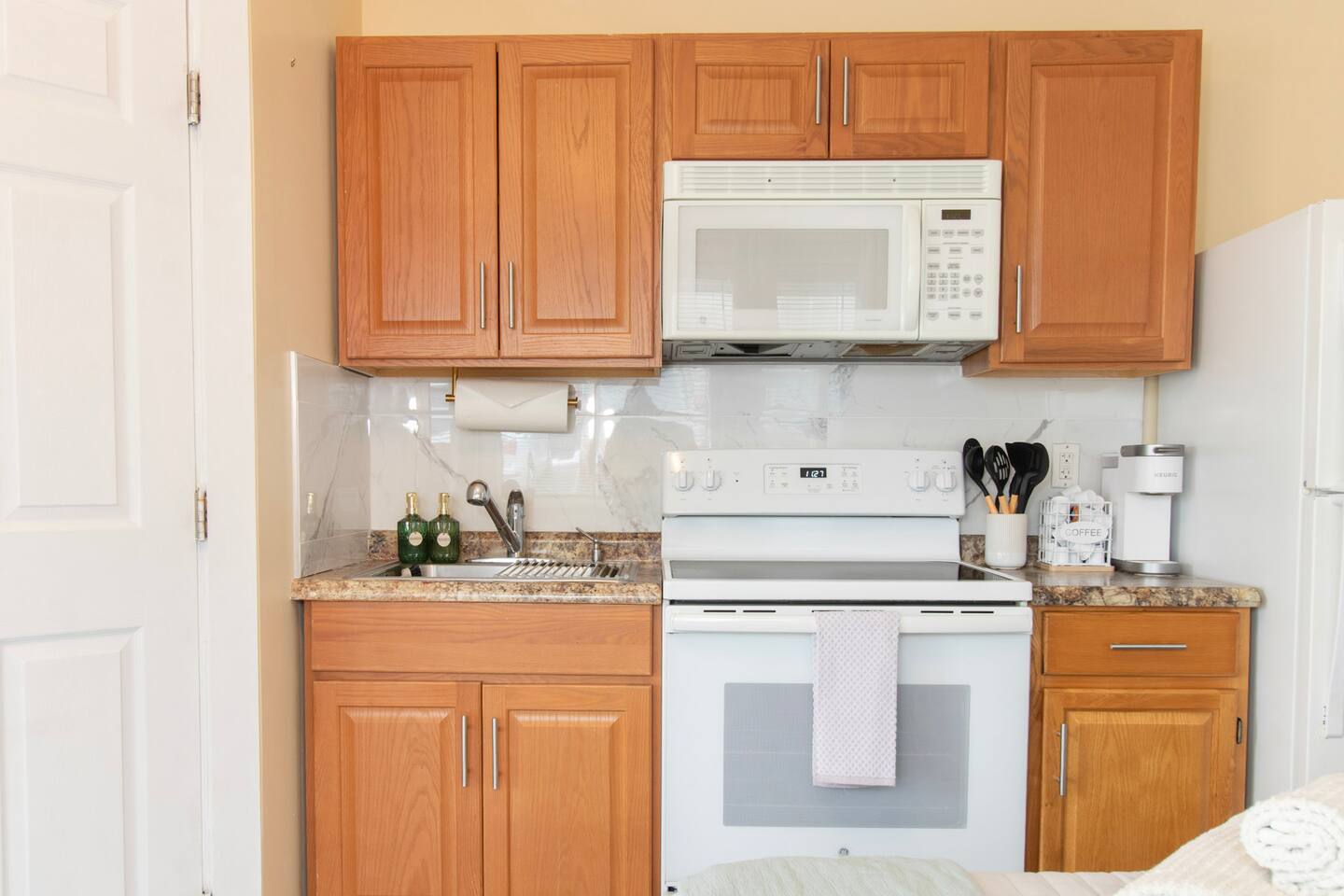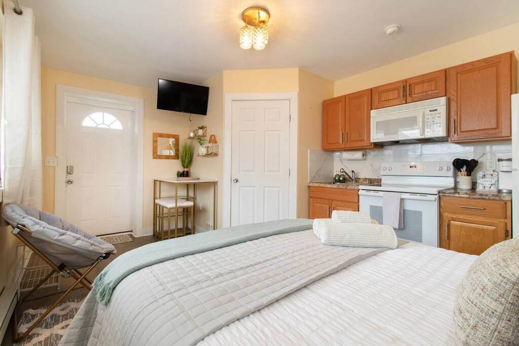 Welcome to your cozy Groton getaway—a thoughtfully designed studio that proves great things come in small packages. This bright, modern space is perfect for solo travelers, couples, or business guests looking for comfort, style, and an unbeatable central location. The studio is filled with natural light, creating an open and airy feel that makes the space feel larger than it is. Clean lines, modern finishes, and carefully chosen décor give it a fresh, contemporary vibe while still feeling warm and inviting. Whether you’re visiting for work, a weekend escape, or an extended stay, you’ll find everything you need to feel right at home. When unpacking, space can be a bit limited, but there is a small set of drawers and an area to hang some clothes. For convenience, suitcases can be placed under the bed. The sleeping area is designed for comfort and rest, with a plush memory foam mattress, soft linens, and thoughtful touches that make winding down easy. The compact layout is intentional and efficient—every inch is used wisely without feeling cramped. A cozy seating area provides a comfortable spot to relax, read, or catch up on your favorite shows after a day of exploring. The chair even folds down and can be placed under the bed for extra room. The modern kitchenette is ideal for preparing simple meals or morning coffee. It’s equipped with essential appliances, cookware, and dishware, making it easy to enjoy breakfast before heading out or a quiet night in. The sleek, updated bathroom features a clean, modern design and all the essentials for a refreshing stay. One of the studio’s biggest highlights is its central location. The building is in an industrial part of town, but don't let that deter you as you’ll be just minutes from several beaches including rocky neck, the popular towns of Mystic & New London, the naval submarine base, and the area’s infamous casinos. Whether you’re here to explore the coast, visit nearby attractions, or commute to work, getting around is quick and convenient. If you’re looking for a small but stylish space that’s bright, modern, cozy, and perfectly located, this Groton studio is an ideal choice. Simple, comfortable, and thoughtfully curated—this is a place where you can relax, recharge, and enjoy everything the area has to offer.